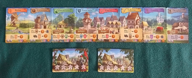 Bien, el juego es simple. Cada jugador tiene ante él 8 cartas que conforman un poblado, con 8 edificios diferentes y una carta en la que hay espacio marcado para 5 Meeples. En el centro se disponen 6 cartas con personajes y un mazo de repuesto.
