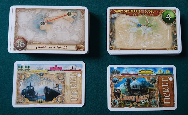 Y luego las cartas. Hay dos mazos de destinos, uno para la vuelta al mundo y otra para los Grandes Lagos.