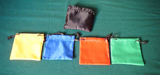 Cuatro dados de colores y cinco bolsas bastante chulas.