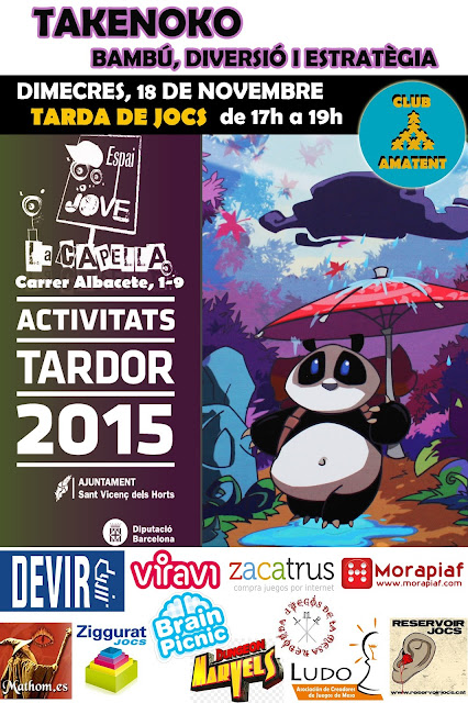No aviso con mucho tiempo de antelación, pero para los posibles interesados hoy se hará tarde de juegos en Sant Josep, siendo el precioso panda de Takenoko el protagonista principal de la tarde de vicio.